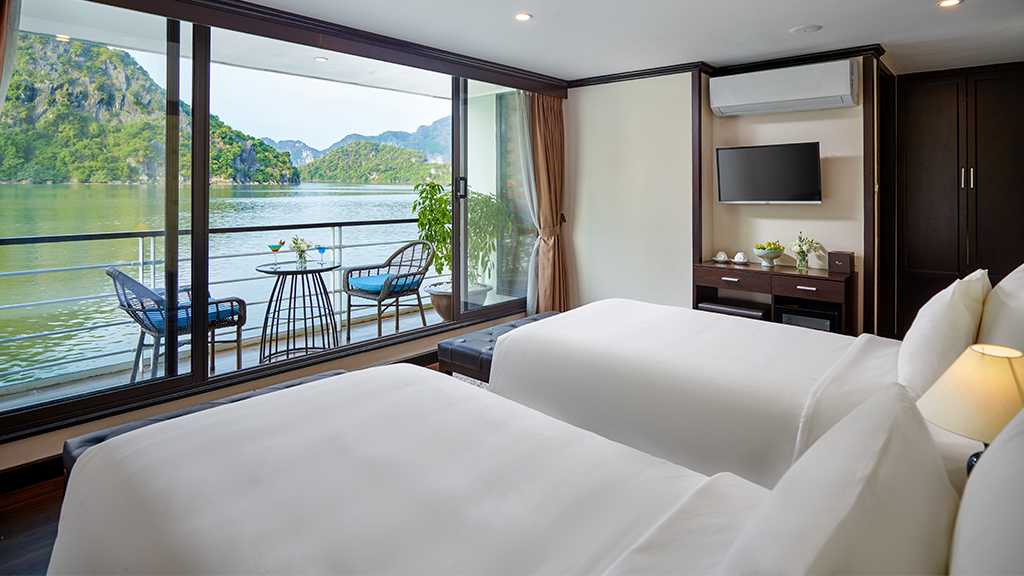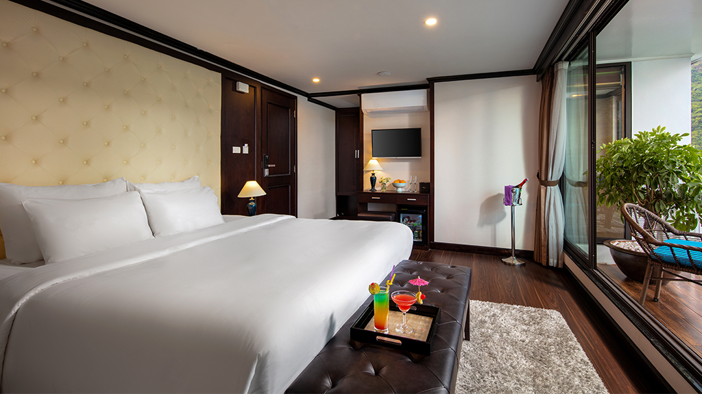 Quý khách thưởng thức đồ uống, thư giãn và hát karaoke tận hưởng cuộc sống về đêm của vịnh Hạ Long từ trên boong tàu. Ngoài ra, Quý khách có thể nghỉ ngơi trực tiếp trong phòng và ngắm Vịnh từ ban công hoặc tham gia hoạt động câu mực.