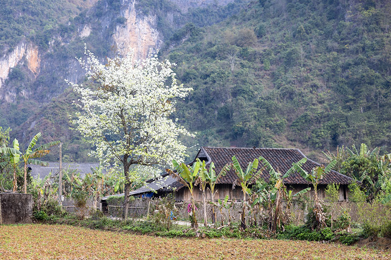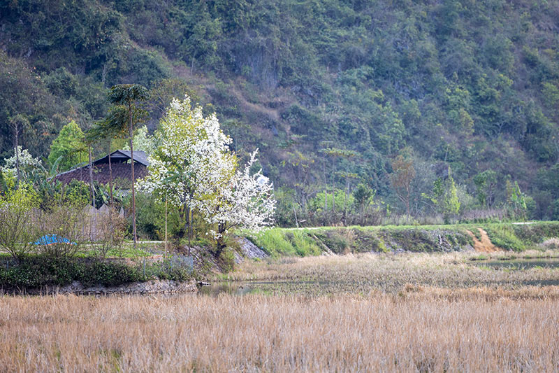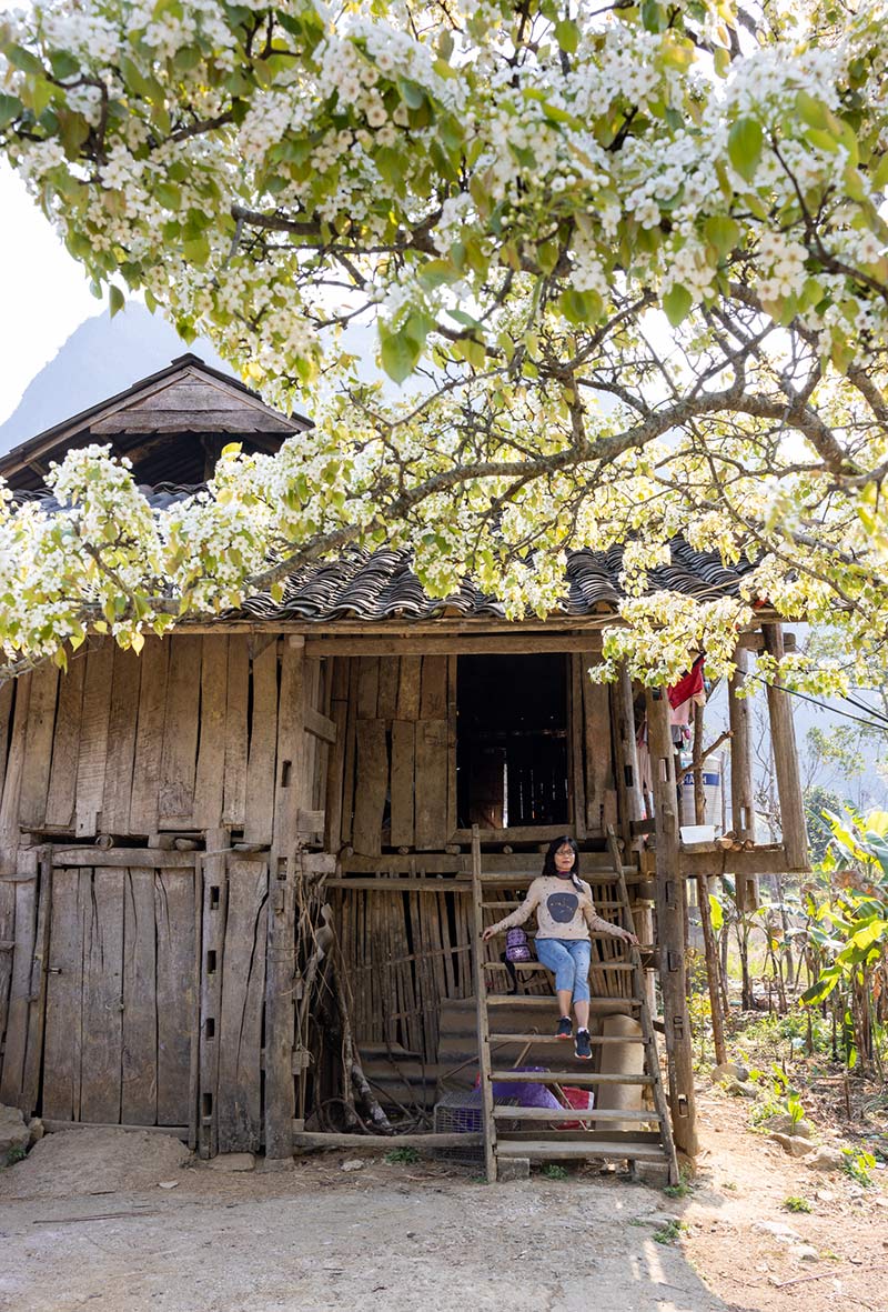 Anh Chiêm chia sẻ: “Đường từ Hà Nội đến Bảo Lạc khá xa, mất khoảng 7 tiếng lái xe. Đoạn từ Nguyên Bình tới Bảo Lạc, đường rất xấu, nhiều khúc cua, có đoạn đường đang làm chỉ qua lọt một xe, rất khó cho xe gầm thấp. Đây cũng là lần đầu tiên mình đi qua một cung đường vất vả như thế“. Xe dừng ở homestay thuộc xã Xuân Trường, thuộc địa phận huyện Bảo Lạc. Nhóm check-in, nghỉ ngơi để chuẩn bị sáng hôm sau dậy sớm ngắm cảnh, chụp ảnh cùng hoa mác cọt.