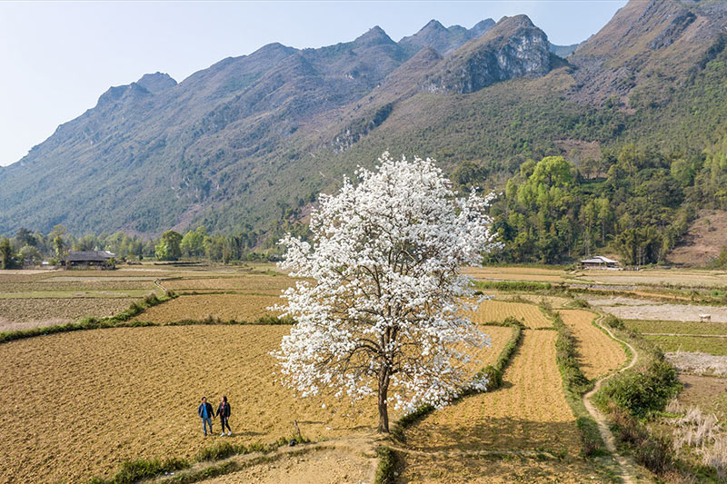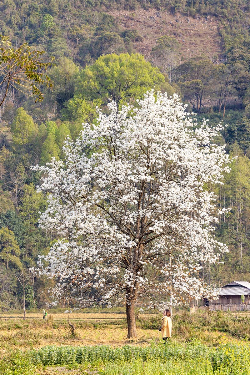 Anh Chiêm cho biết, cây mác cọt nằm ngay bên đường Quốc lộ đi qua xã Xuân Trường (Bảo Lạc), chỉ cách khoảng 150m. Từ xa, du khách đã có thể nhìn thấy cây cao sừng sững với những tán cây đã phủ đầy hoa màu trắng xóa đẹp mắt.